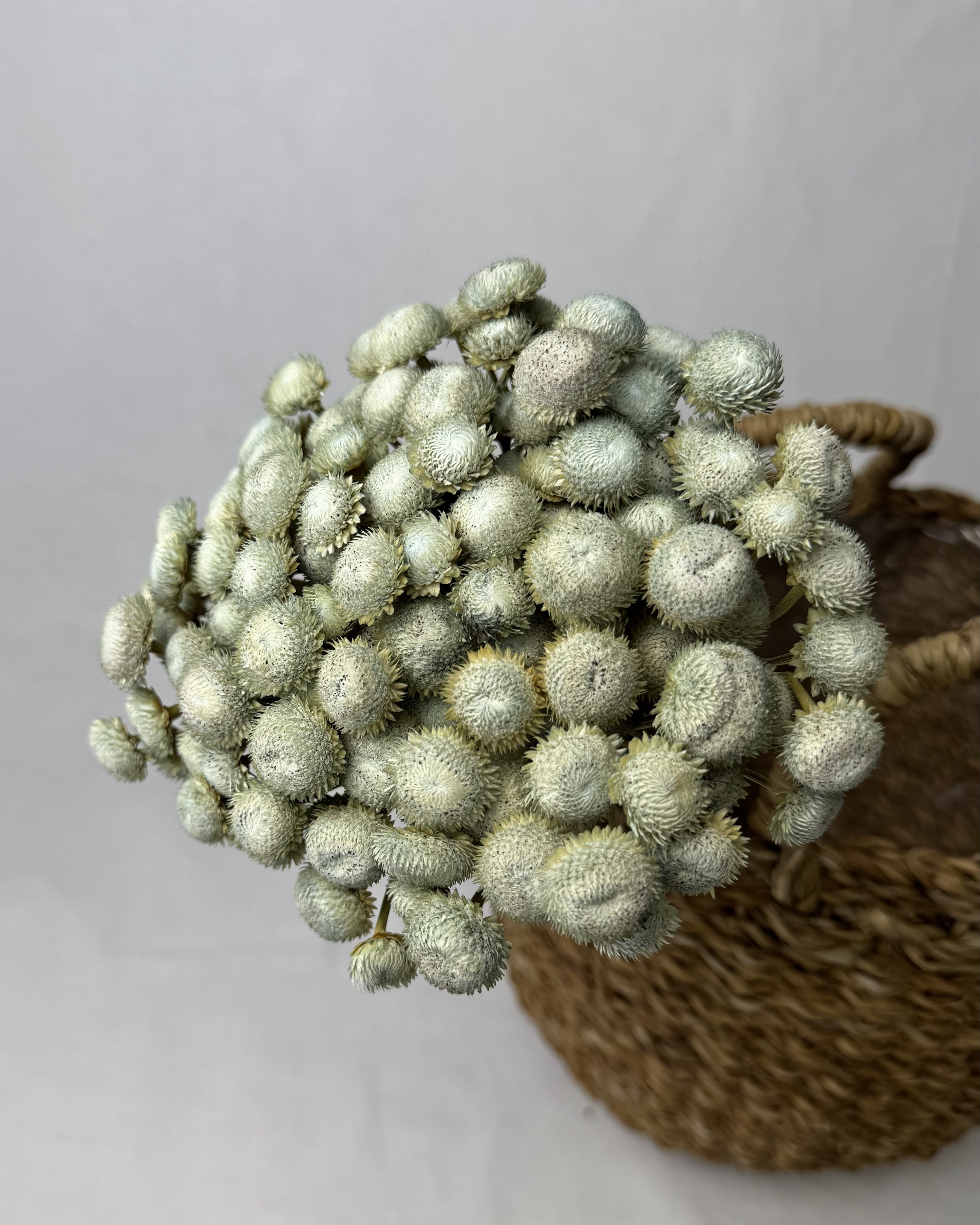 Unser Botao-Bund in edlem Blaugrün überzeugt mit seinen zarten, kugelförmigen Blüten und bringt frische, natürliche Akzente in jedes Arrangement. Die getrockneten Blüten sind langlebig, pflegeleicht und eignen sich ideal für Sträuße, Kränze, Gestecke oder kreative DIY-Projekte. Mit seinem besonderen Farbton verleiht der ca. 100 g schwere Bund jeder Dekoration eine moderne, stilvolle Note.
