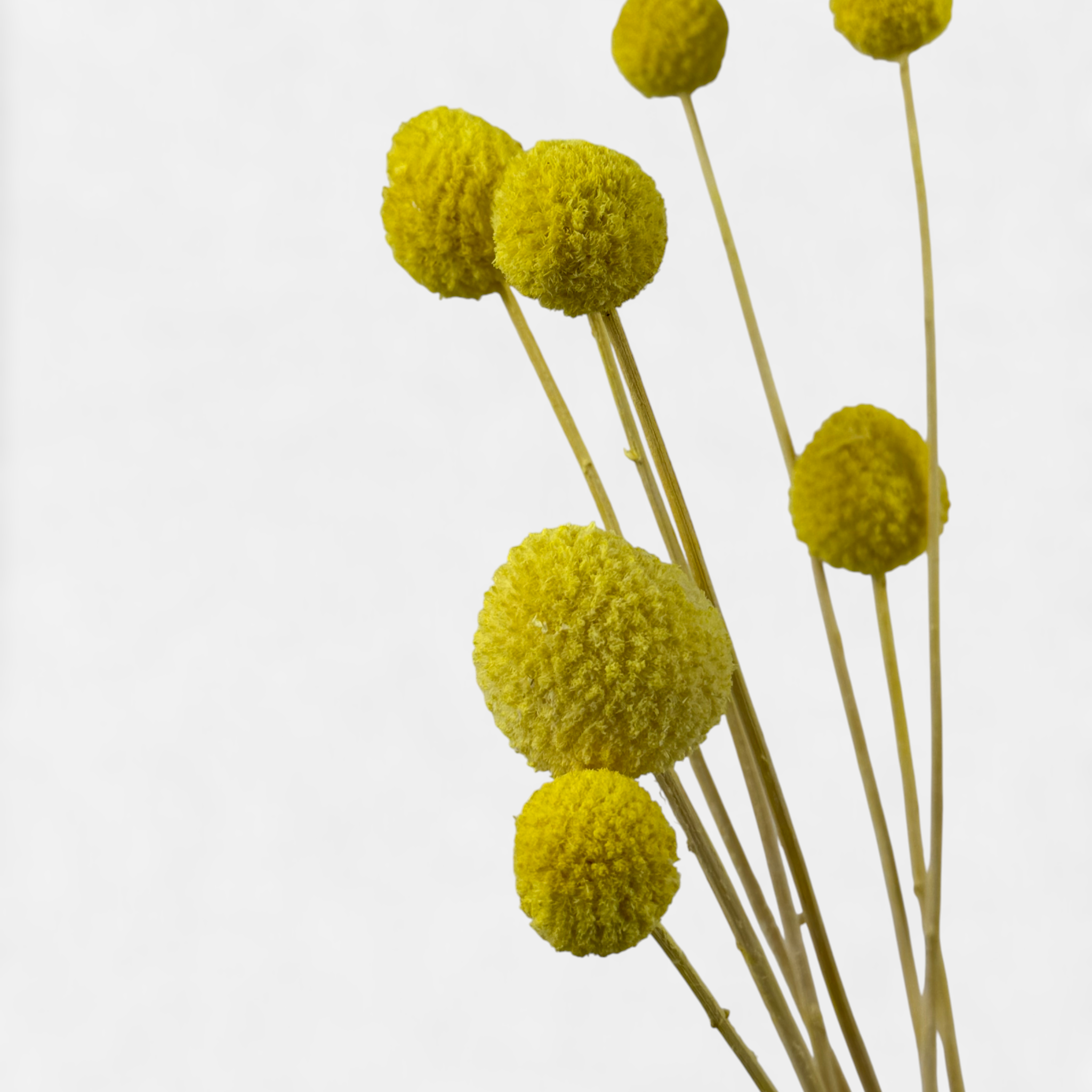 Die leuchtenden Craspedia, auch bekannt als Trommelstöckchen, bringen sofort gute Laune in dein Zuhause. Mit ihren perfekt runden Blütenköpfen und den langen, stabilen Stielen setzen sie moderne, minimalistische und natürliche Deko-Highlights.
