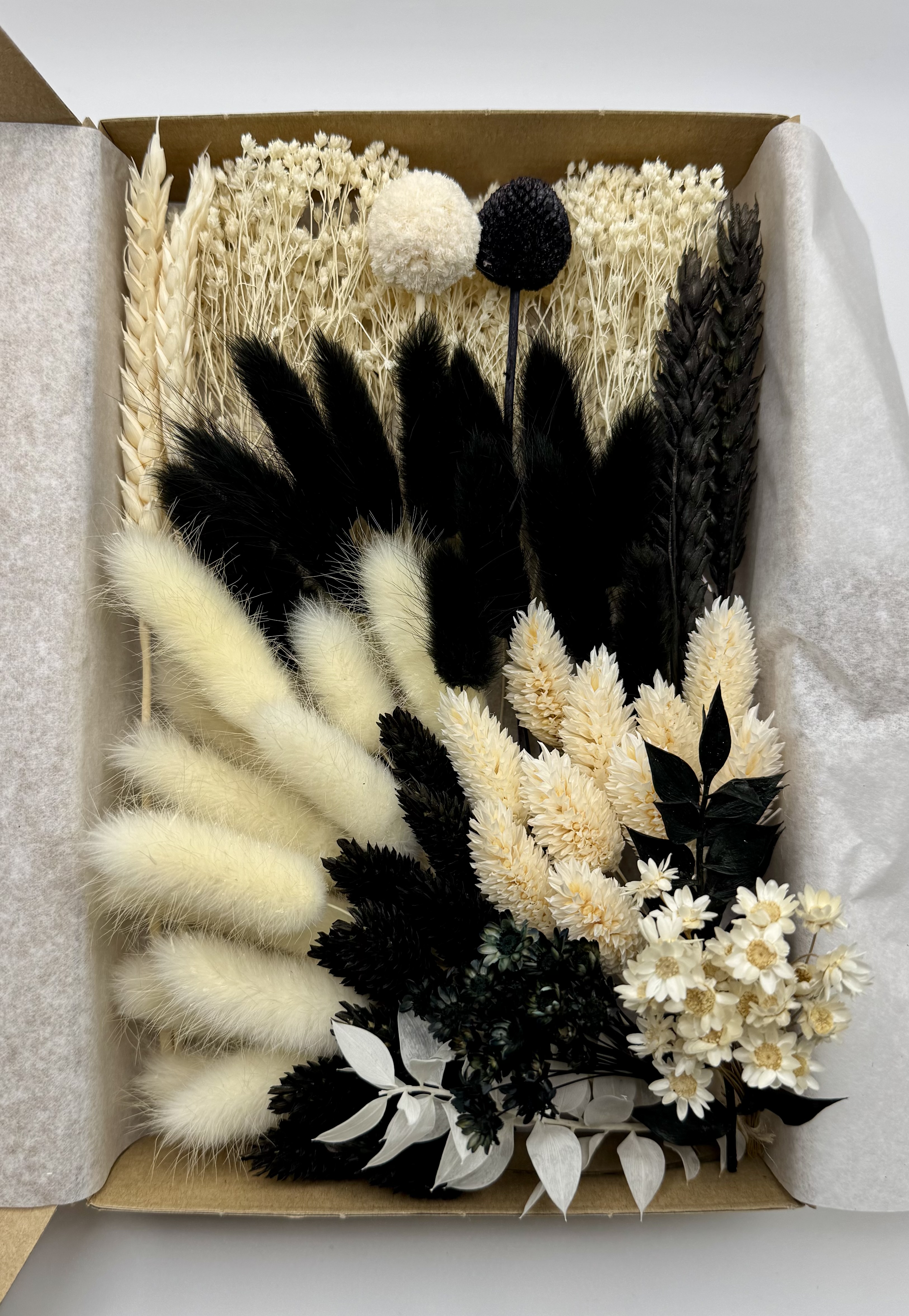 Die stilvolle Box „Black Moon“ enthält eine edle Auswahl an Trockenblumen in Weiß-, und Schwarztönen – darunter Lagurus (Hasenschwänzchen), Phalaris, Broom Bloom, Craspedia, Weizen, Ruscus und Glixia.