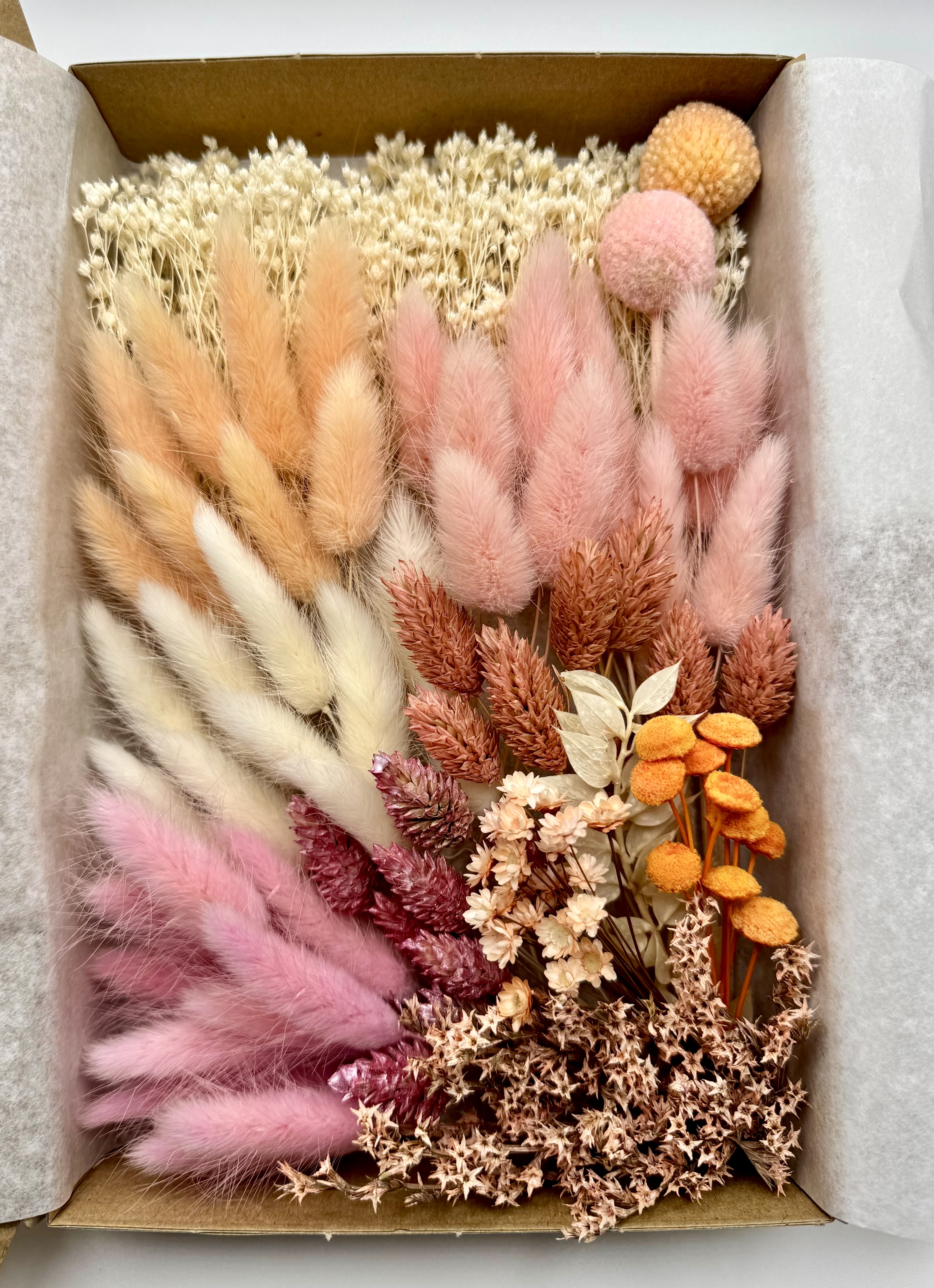 Die stilvolle Box „Crystal Rose“ enthält eine edle Auswahl an Trockenblumen in kräftigen Peach-, Rosa und Weißtönen – darunter Lagurus (Hasenschwänzchen), Phalaris, Broom Bloom, Craspedia, Glixia, Botao, Ruscus und Strandflieder.