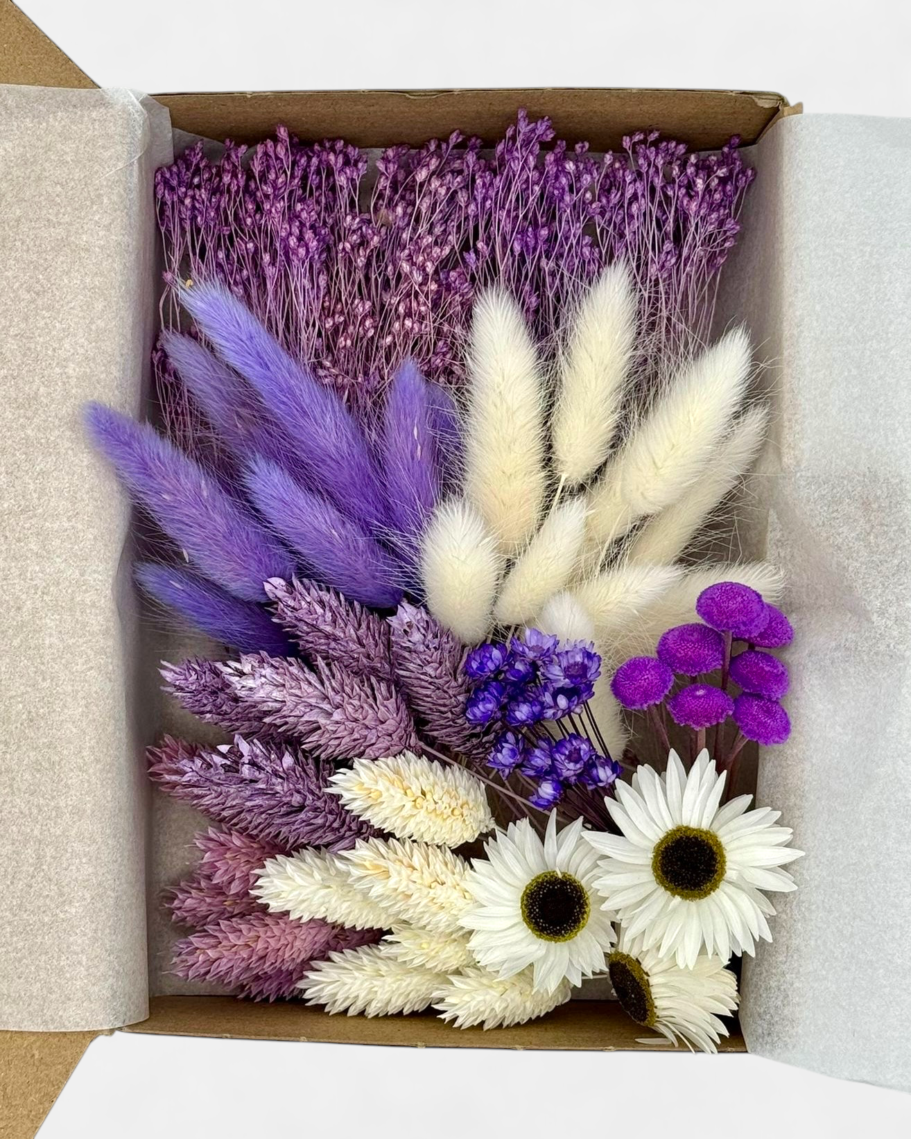 Die stilvolle Box „Fliedertraum“ enthält eine edle Auswahl an Trockenblumen in kräftigen Lila-, Flieder- und Weißtönen – darunter Lagurus (Hasenschwänzchen), Phalaris, Broom Bloom, Botao, Glixia und Acroclinium.