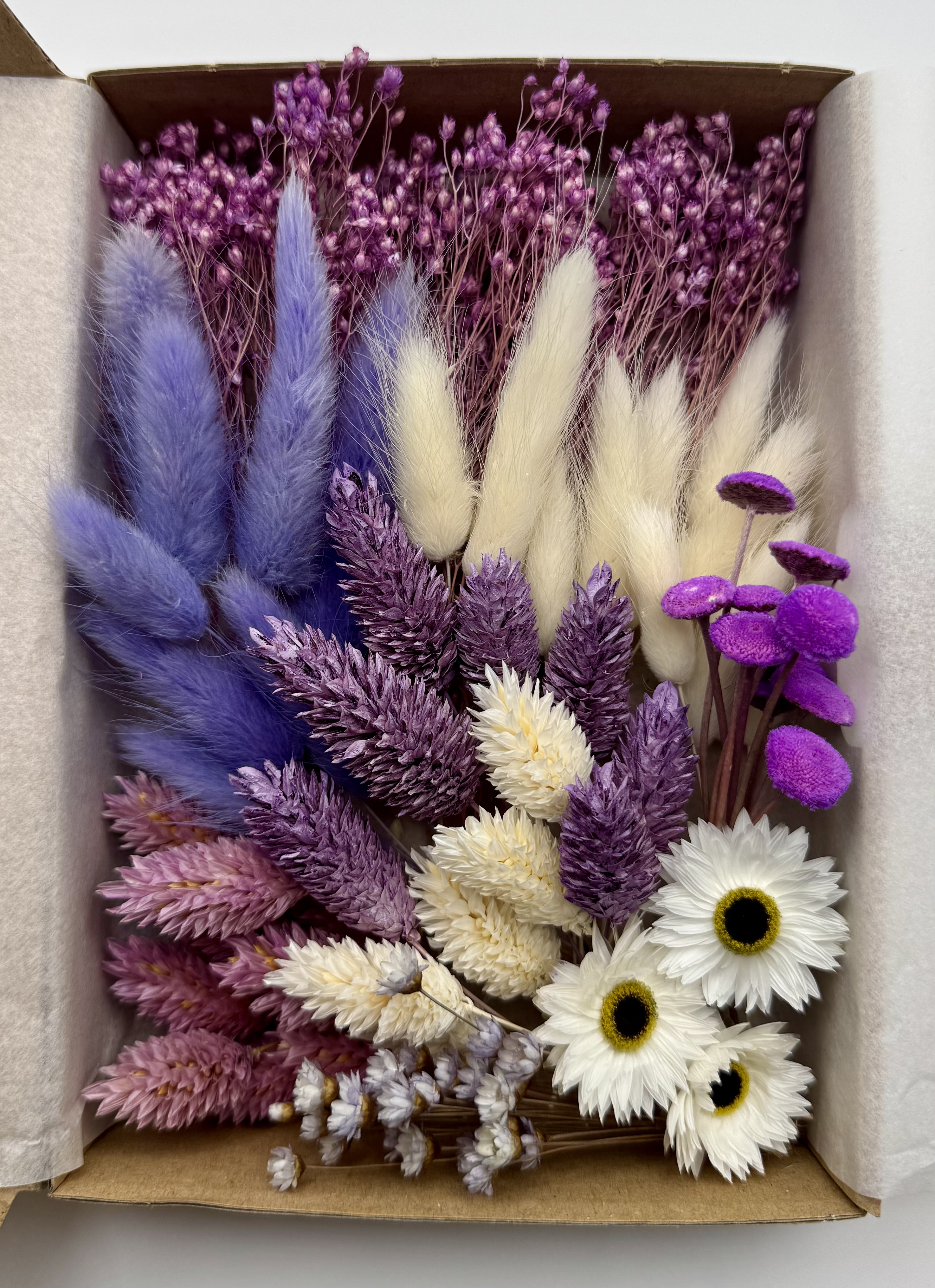 Die stilvolle Box „Fliedertraum“ enthält eine edle Auswahl an Trockenblumen in kräftigen Lila-, Flieder- und Weißtönen – darunter Lagurus (Hasenschwänzchen), Phalaris, Broom Bloom, Botao, Glixia und Acroclinium.