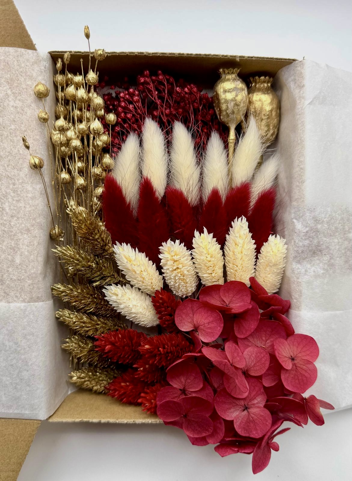 Die stilvolle Box „Glühweinglanz“ enthält eine edle Auswahl an Trockenblumen in kräftigen Rot-, Gold- und Weißtönen – darunter Lagurus (Hasenschwänzchen), Phalaris, Broom Bloom, Lino Flachs, Mohnkapseln und Hortensie.