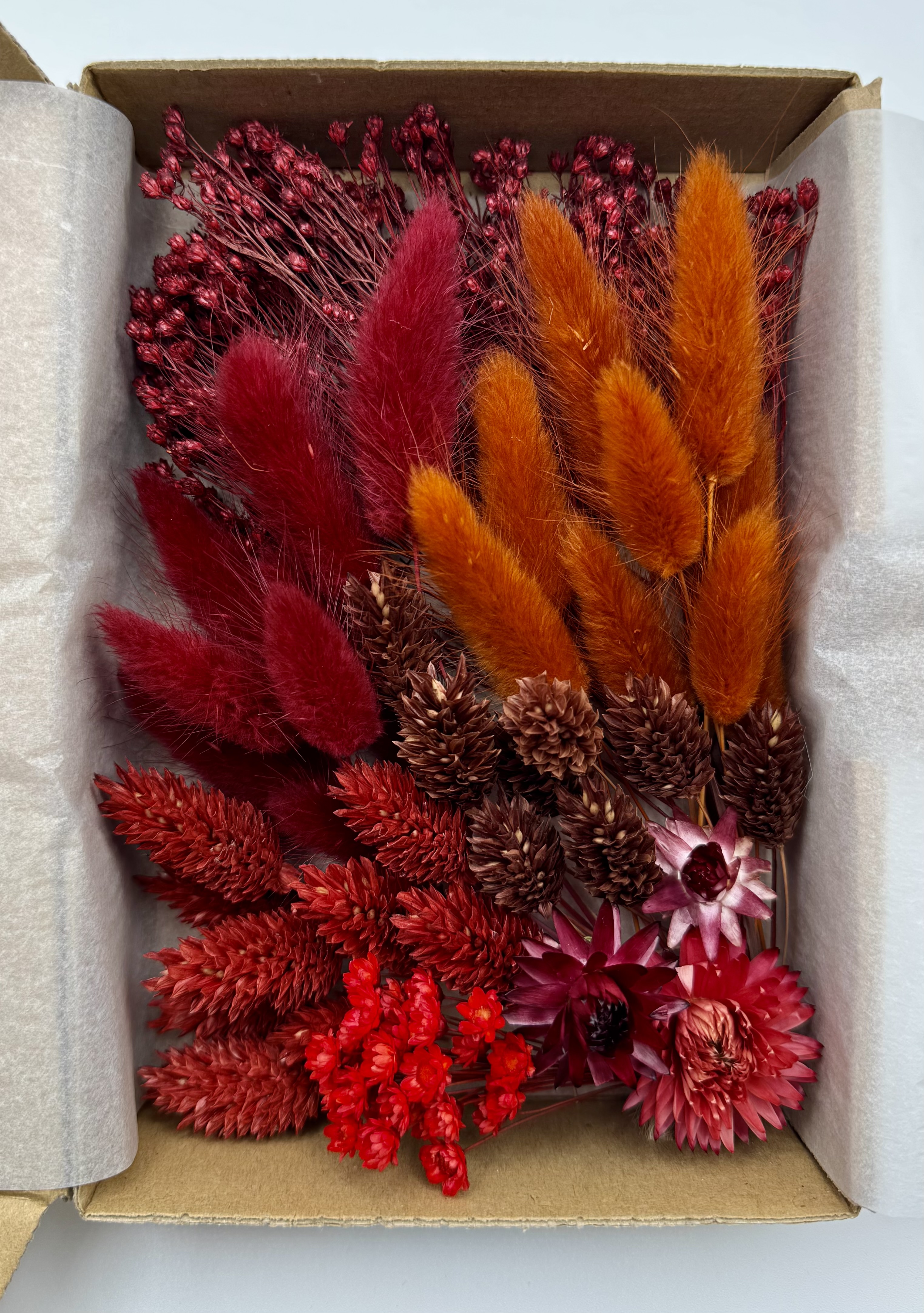 Die stilvolle Box „Granatapfelglanz“ enthält eine edle Auswahl an Trockenblumen in kräftigen Rot- und Terrakottatönen – darunter Lagurus (Hasenschwänzchen), Phalaris, Broom Bloom, Glixia und Strohblume.