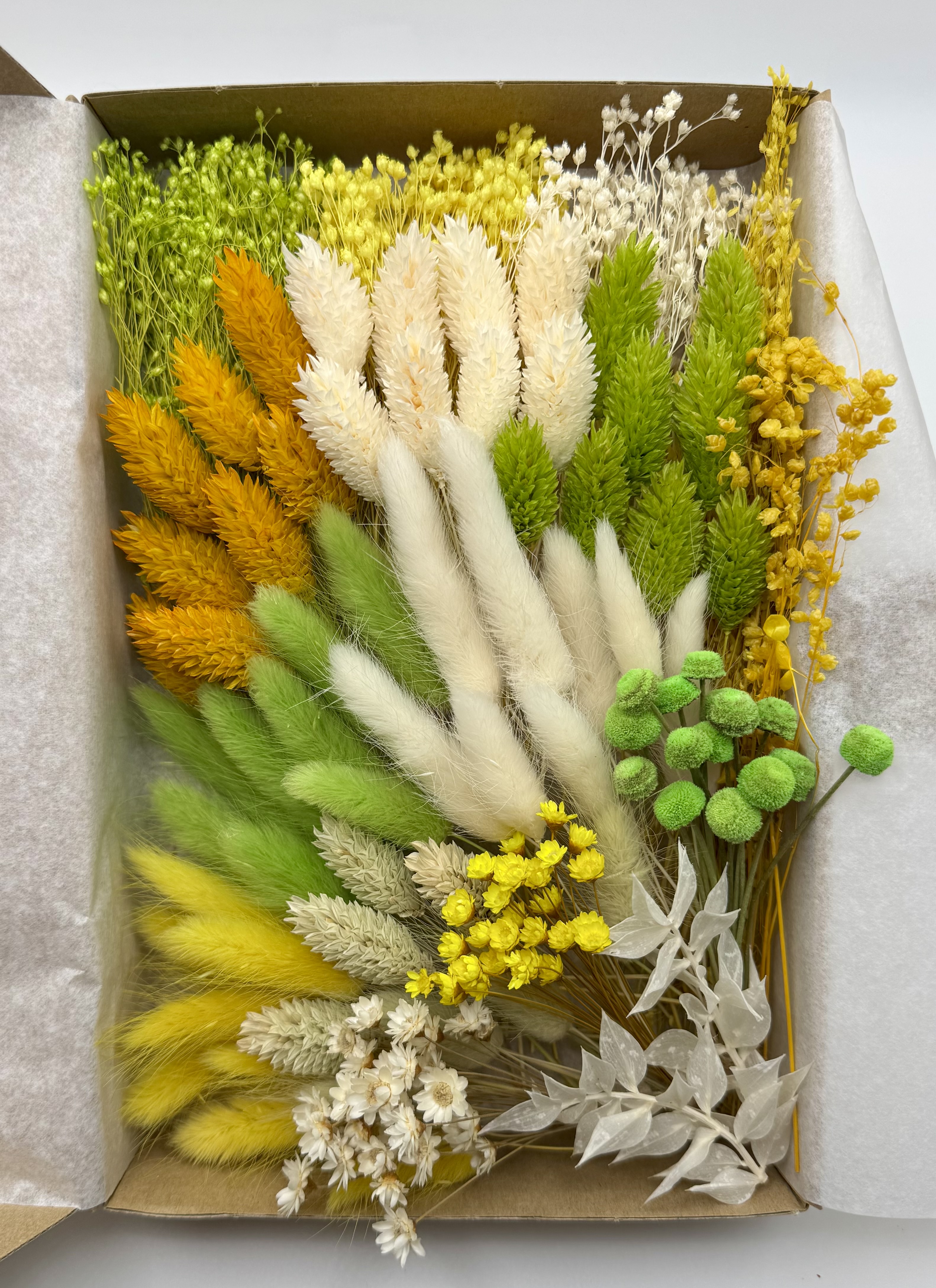Die stilvolle Box „Greeni“ enthält eine edle Auswahl an Trockenblumen in sanften Grün-, Gelb- und Weißtönen – darunter Lagurus (Hasenschwänzchen), Phalaris, Broom Bloom, Botao, Briza, Ruscus und Glixia.