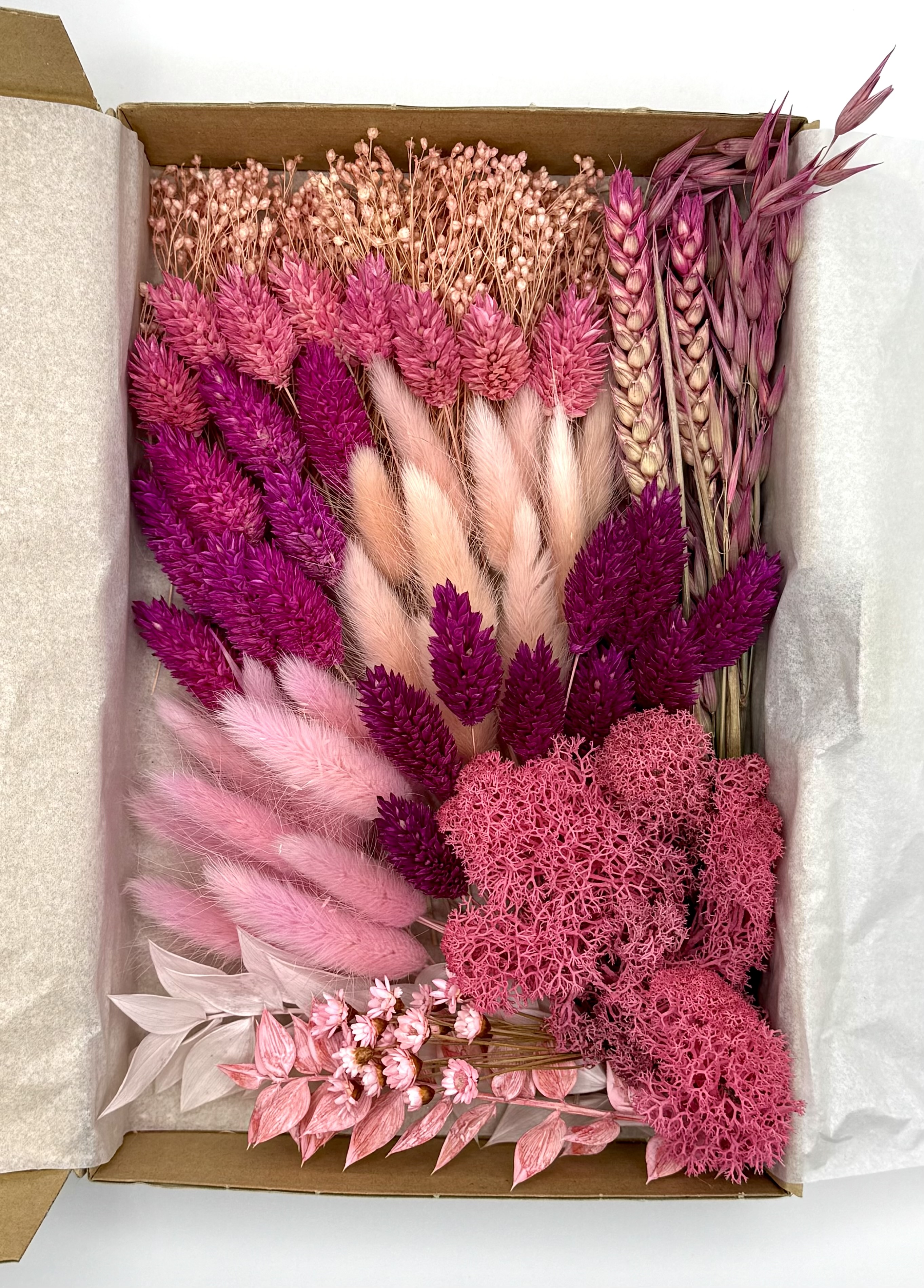 Die stilvolle Box „Kirschblüte“ enthält eine edle Auswahl an Trockenblumen in Rosa-, und Pinktönen – darunter Lagurus (Hasenschwänzchen), Phalaris, Broom Bloom, Hafer, Weizen, Ruscus, Islandmoos und Glixia.