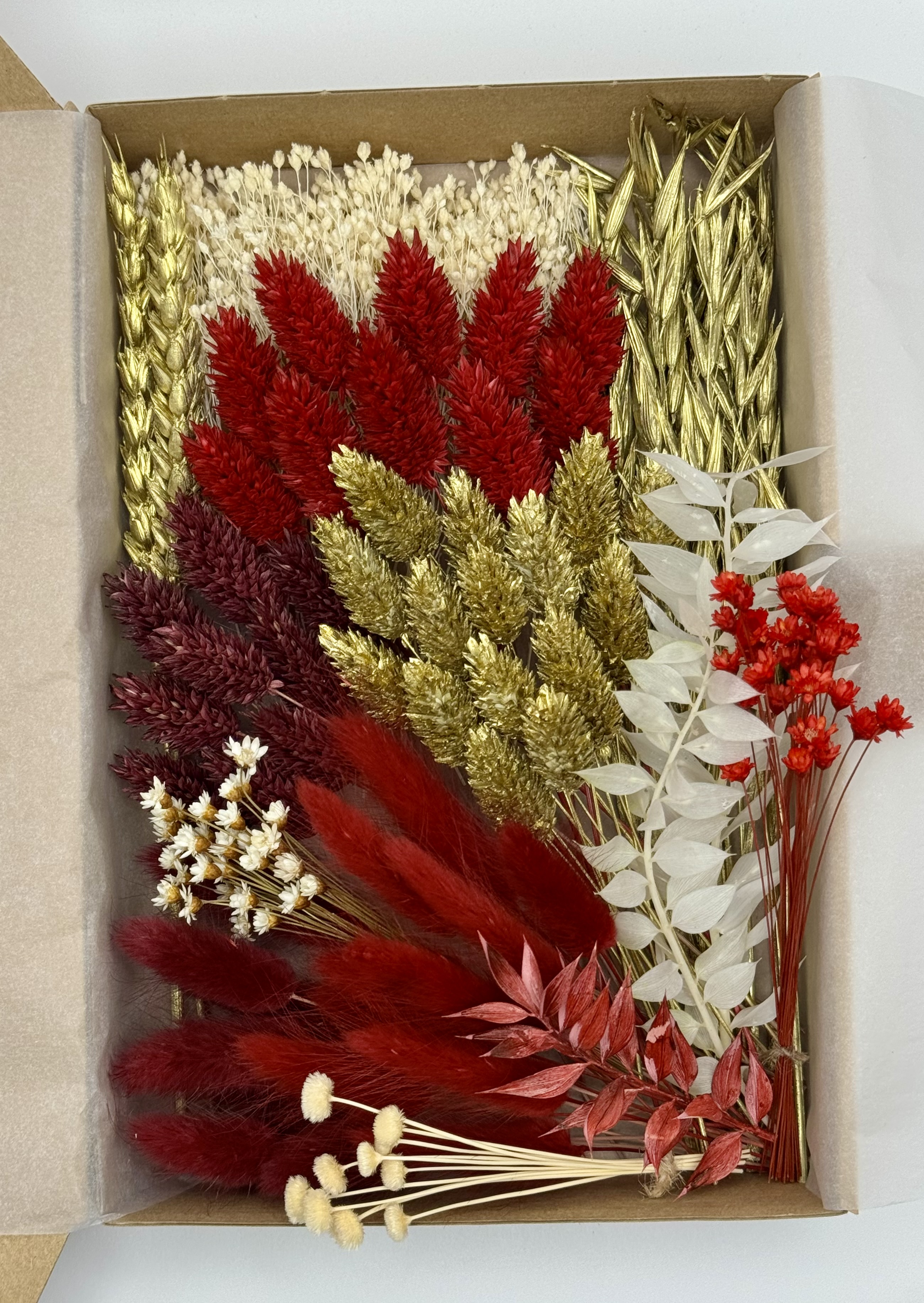 Die stilvolle Box „Kuschelwinter“ enthält eine edle Auswahl an Trockenblumen in kräftigen Rot-, Gold- und Weißtönen – darunter Lagurus (Hasenschwänzchen), Phalaris, Broom Bloom, Hafer, Weizen, Ruscus, Botao und Glixia.