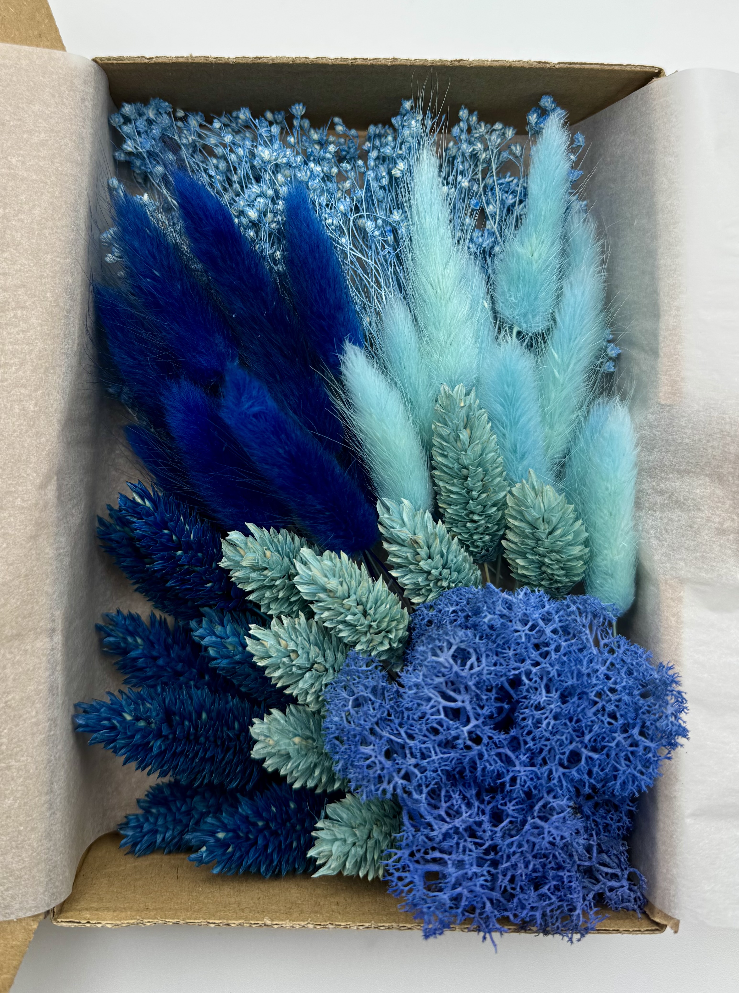 Die stilvolle Box „Meeresrauschen“ enthält eine edle Auswahl an Trockenblumen in Hellblau- und Dunkelblautönen – darunter Lagurus (Hasenschwänzchen), Phalaris, Broom Bloom und Islandmoos.