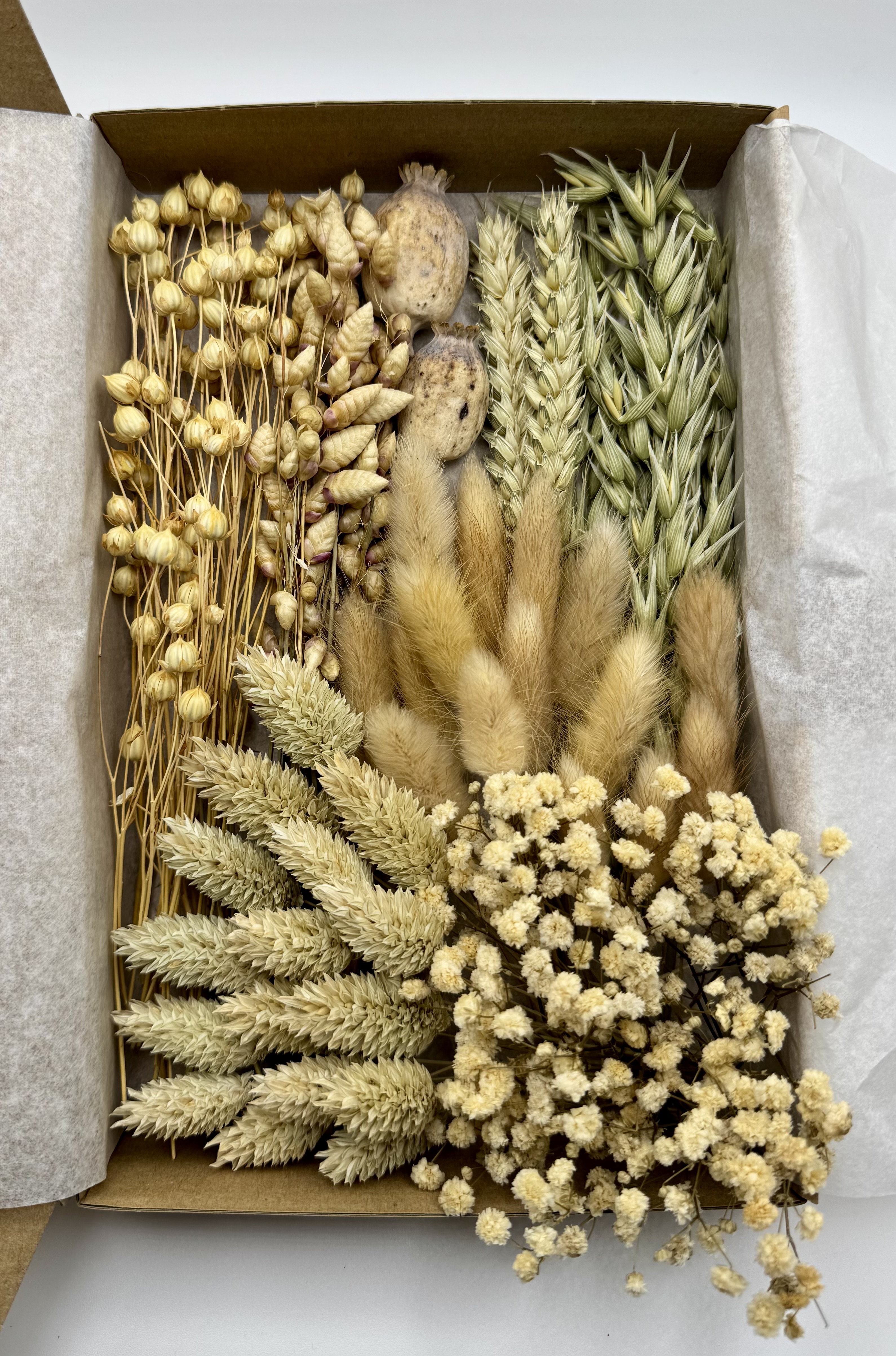 Die stilvolle Box „Naturglanz“ enthält eine edle Auswahl an Trockenblumen in ihren schönen natürlichen Farben – darunter Lagurus (Hasenschwänzchen), Phalaris, Briza, Mohnkapseln, Hafer, Lino Flachs, Weizen und Schleierkraut.