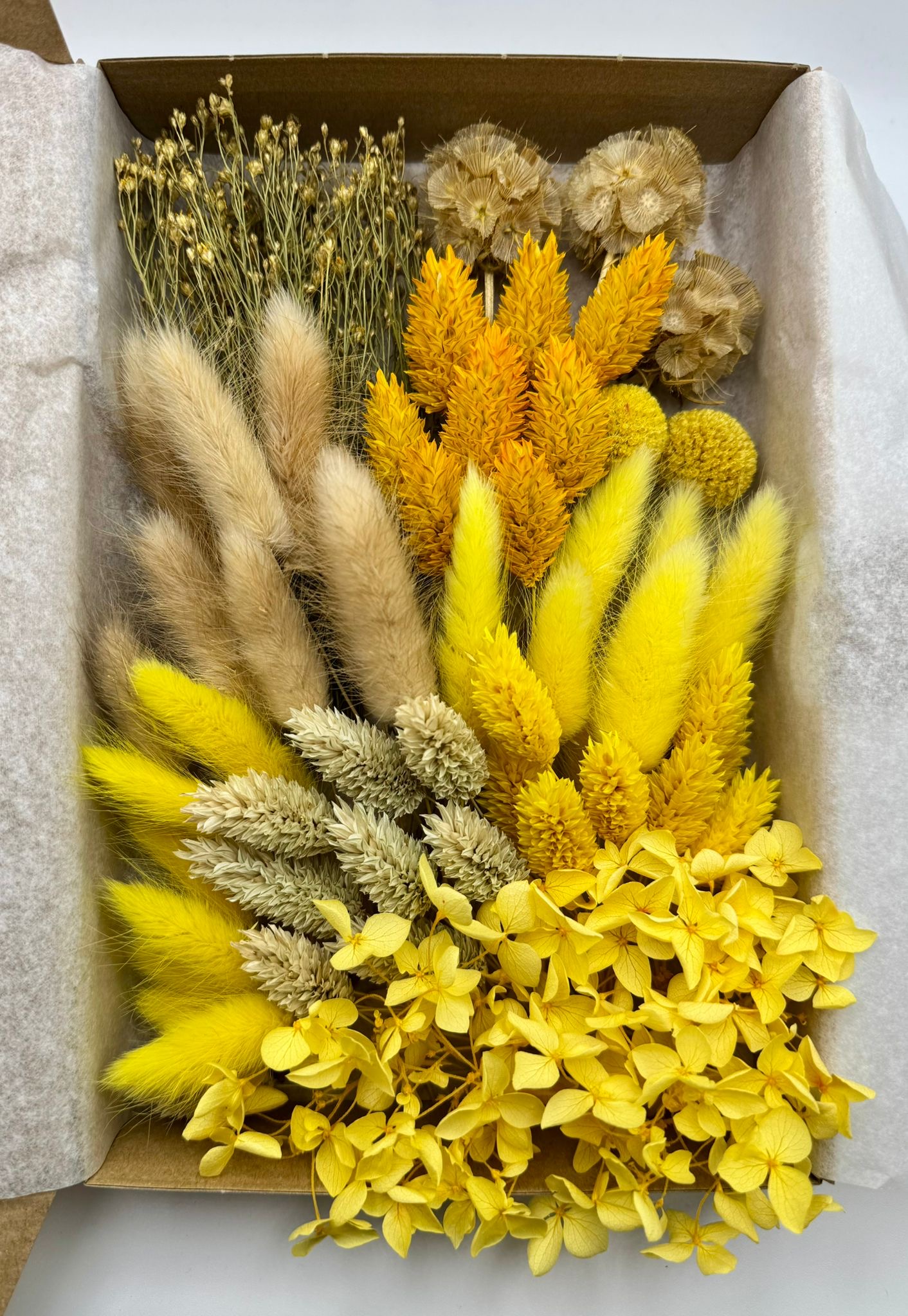 Die stilvolle Box „Sonnenkuss“ enthält eine edle Auswahl an Trockenblumen in satten Gelb-, und Naturtönen – darunter Lagurus (Hasenschwänzchen), Phalaris, Broom Bloom, Scabiosa, Craspedia und Hortensie.