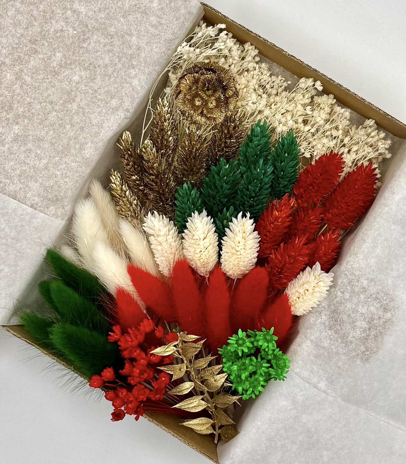 Die stilvolle Box „Tannenzauber“ enthält eine edle Auswahl an Trockenblumen in kräftigen Rot-, Grün-, Gold- und Weißtönen – darunter Lagurus (Hasenschwänzchen), Phalaris, Broom Bloom, Scabiosa, Ruscus und Glixia.