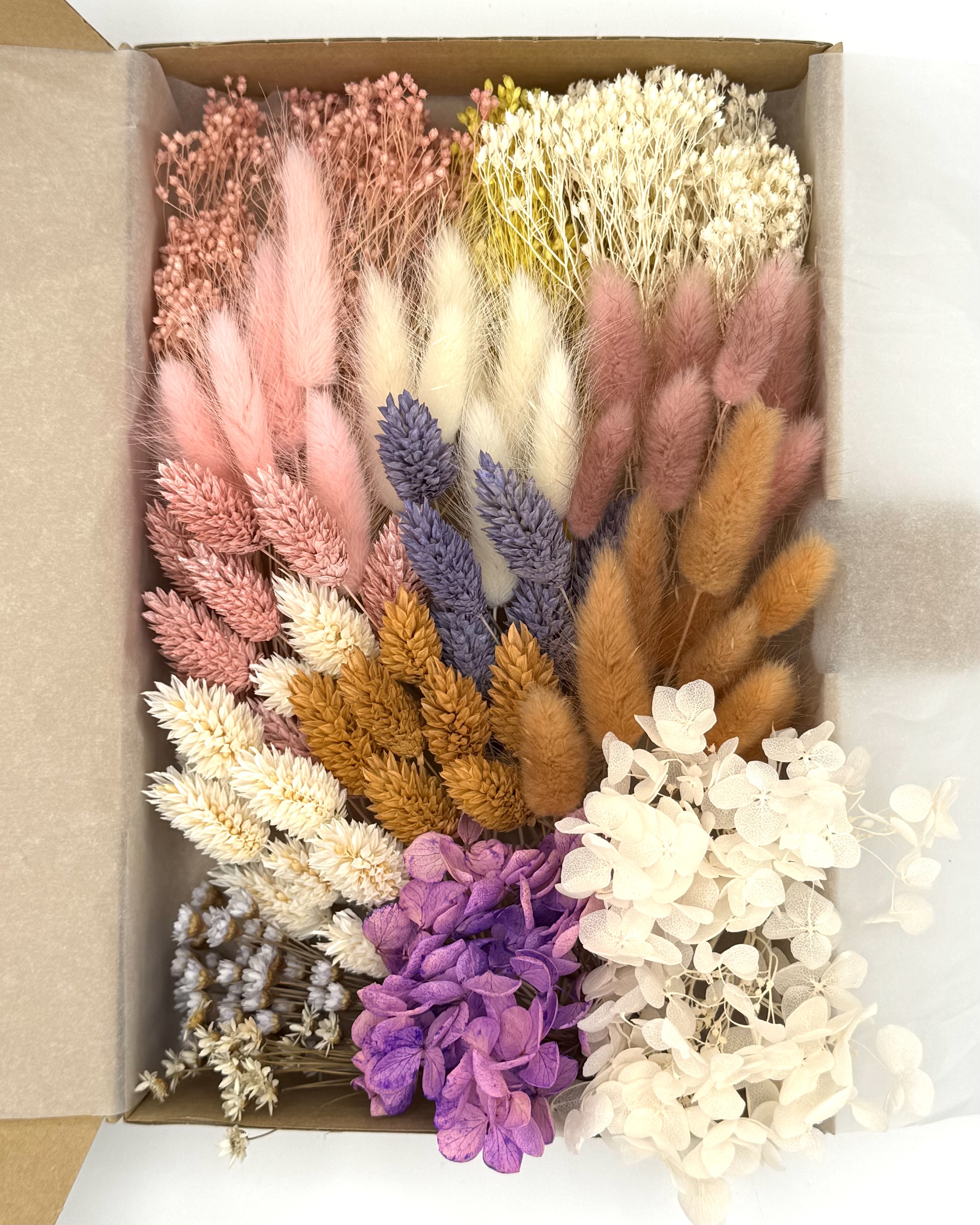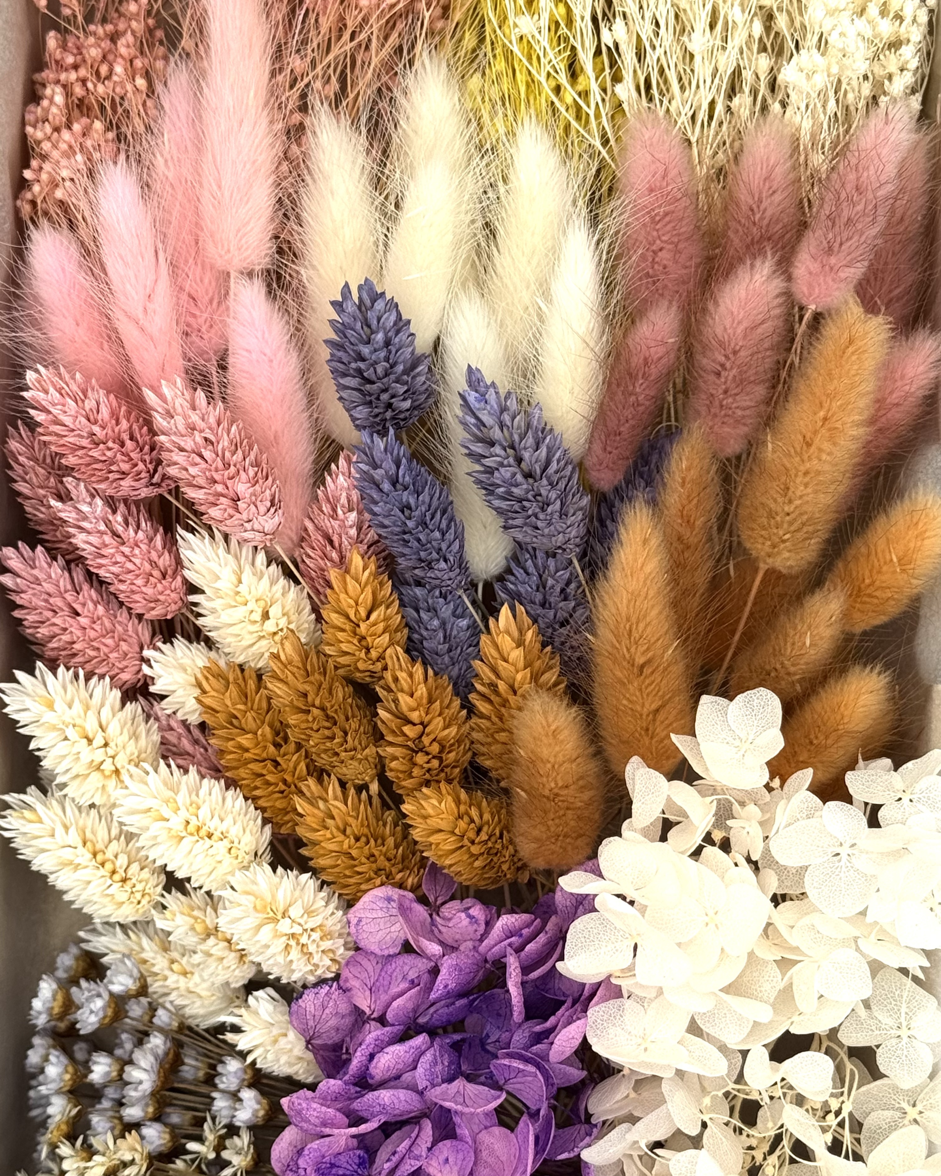 Die stilvolle Box „Wildflower“ enthält eine edle Auswahl an Trockenblumen in Rosa-, Gelb-, Lila-, Braun- und Weißtönen – darunter Lagurus (Hasenschwänzchen), Phalaris, Broom Bloom, Glixia und Hortensie.