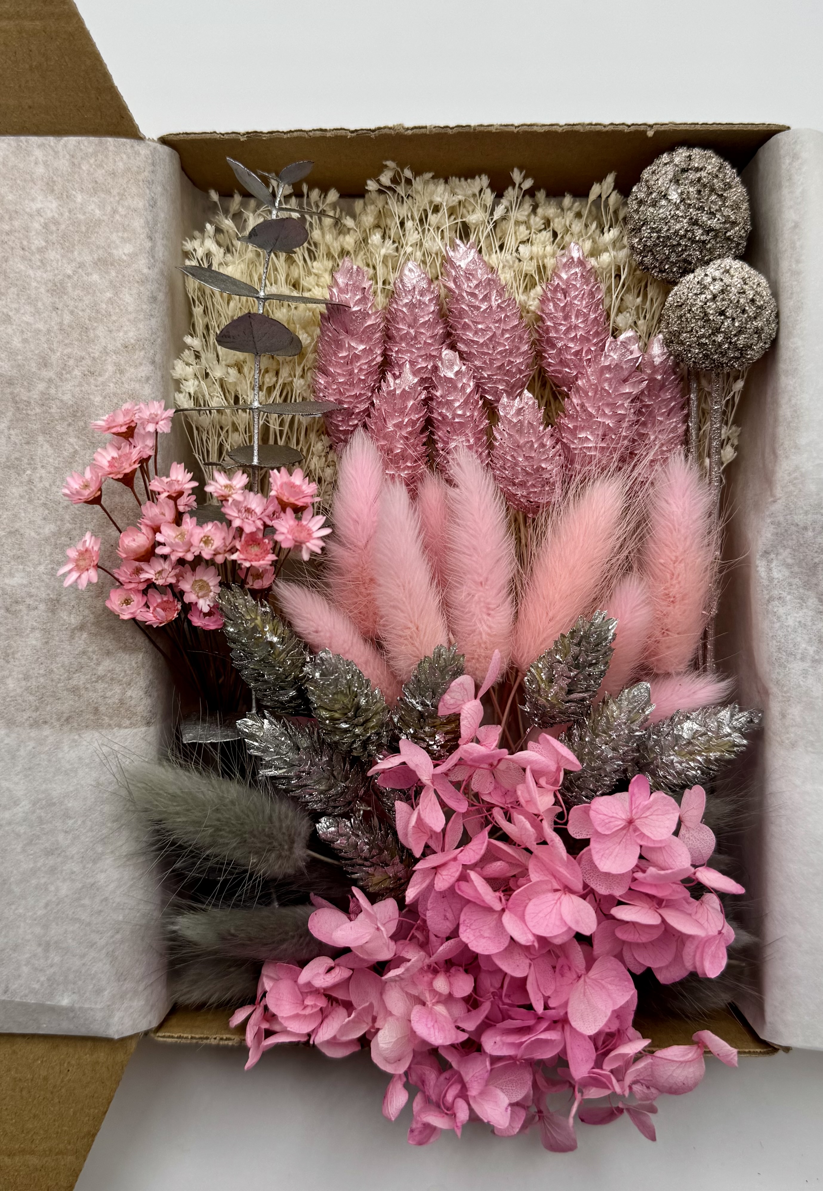 Die stilvolle Box „Winterglanz“ enthält eine edle Auswahl an Trockenblumen in kräftigen Rosa- und Silbertönen – darunter Lagurus (Hasenschwänzchen), Phalaris, Broom Bloom, Craspedia, Eukalyptus, Glixia und Hortensie.