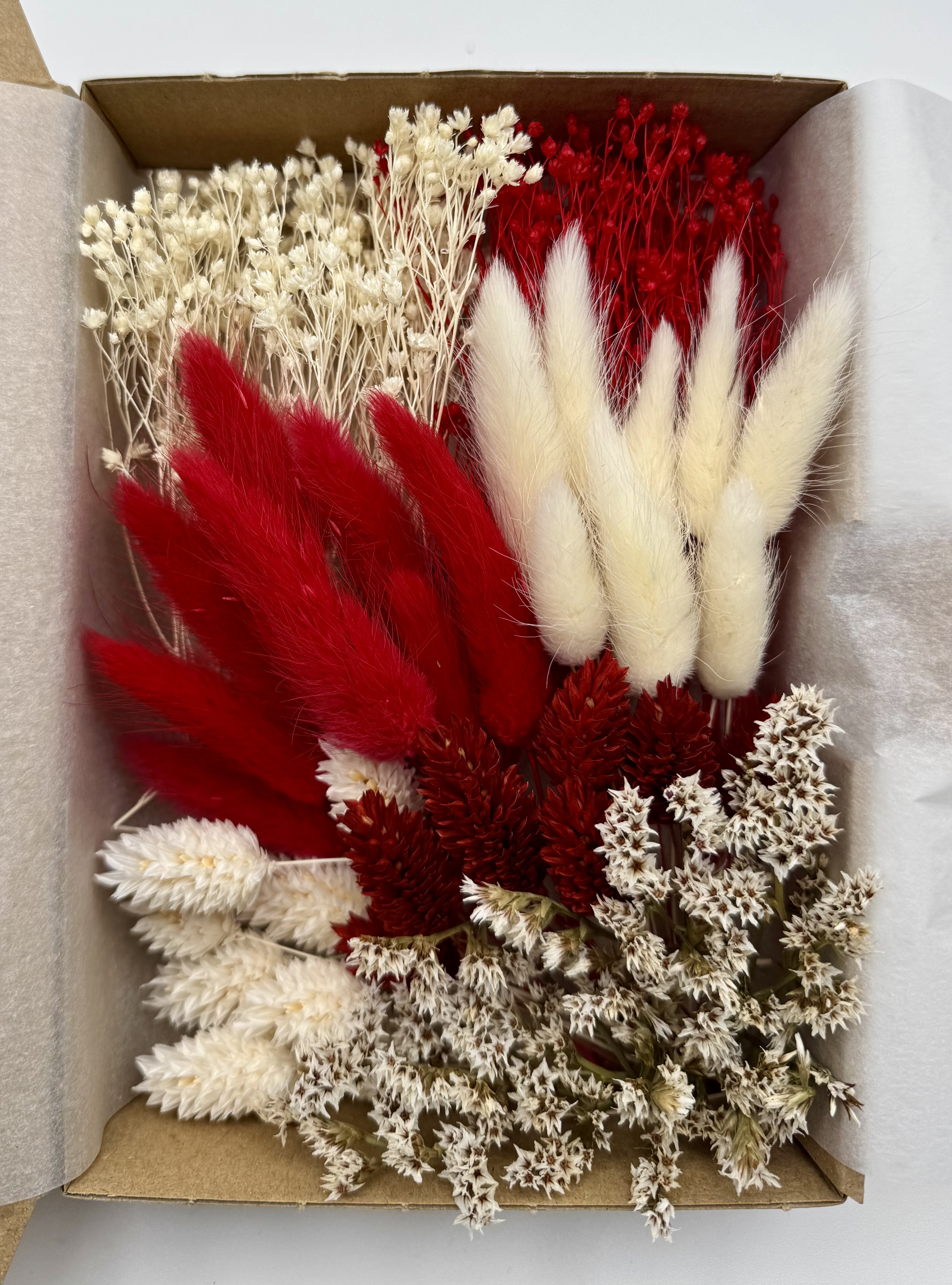 Die stilvolle Box „Wintertraum“ enthält eine edle Auswahl an Trockenblumen in kräftigen Rot- und Weißtönen – darunter Lagurus (Hasenschwänzchen), Phalaris, Broom Bloom und Strandflieder.