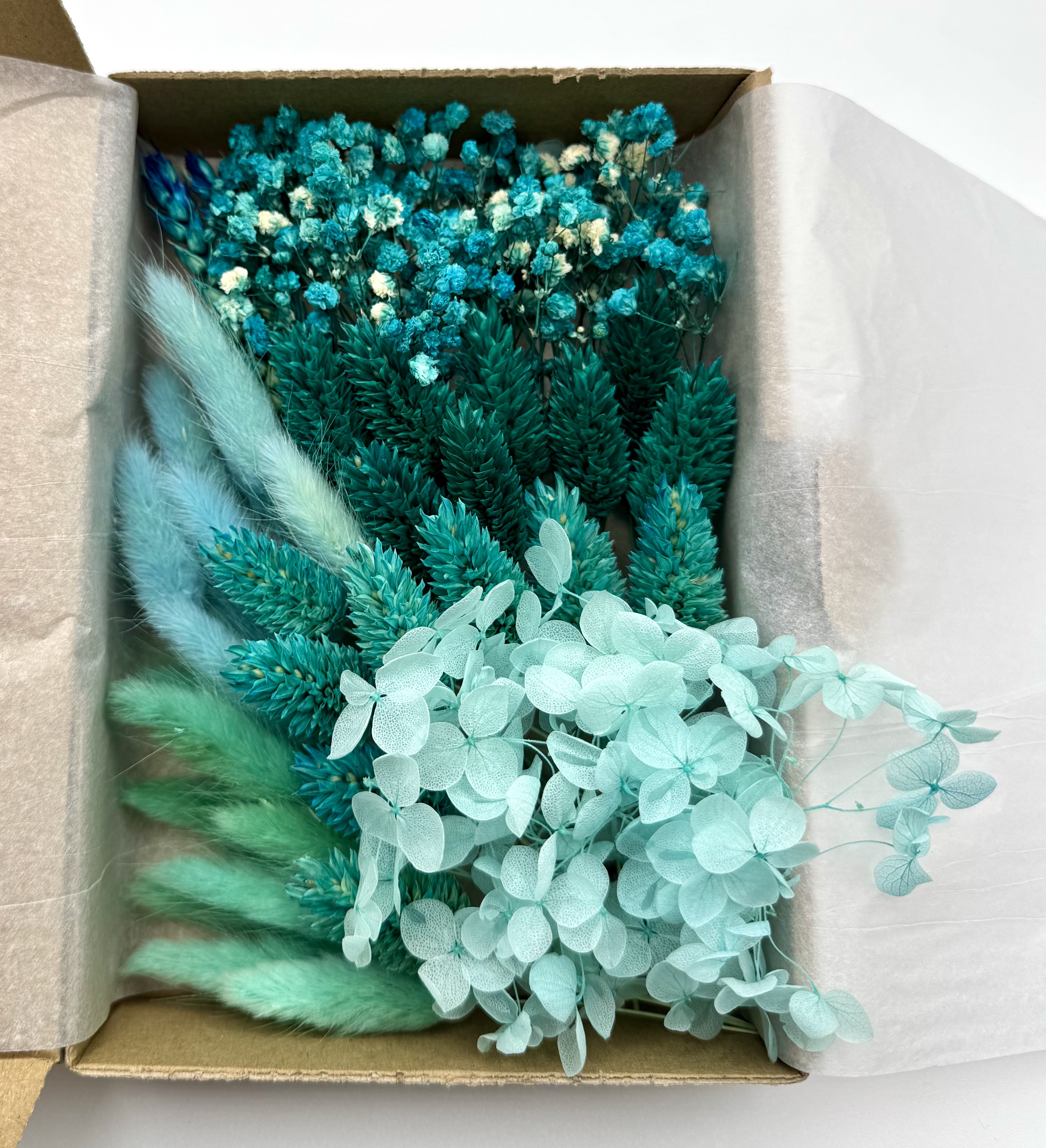 Die stilvolle Box „Wolkenkuss“ enthält eine edle Auswahl an Trockenblumen in Aquablau, Hellblau- und Grüntönen – darunter Lagurus (Hasenschwänzchen), Phalaris, Schleierkraut und Hortensie.