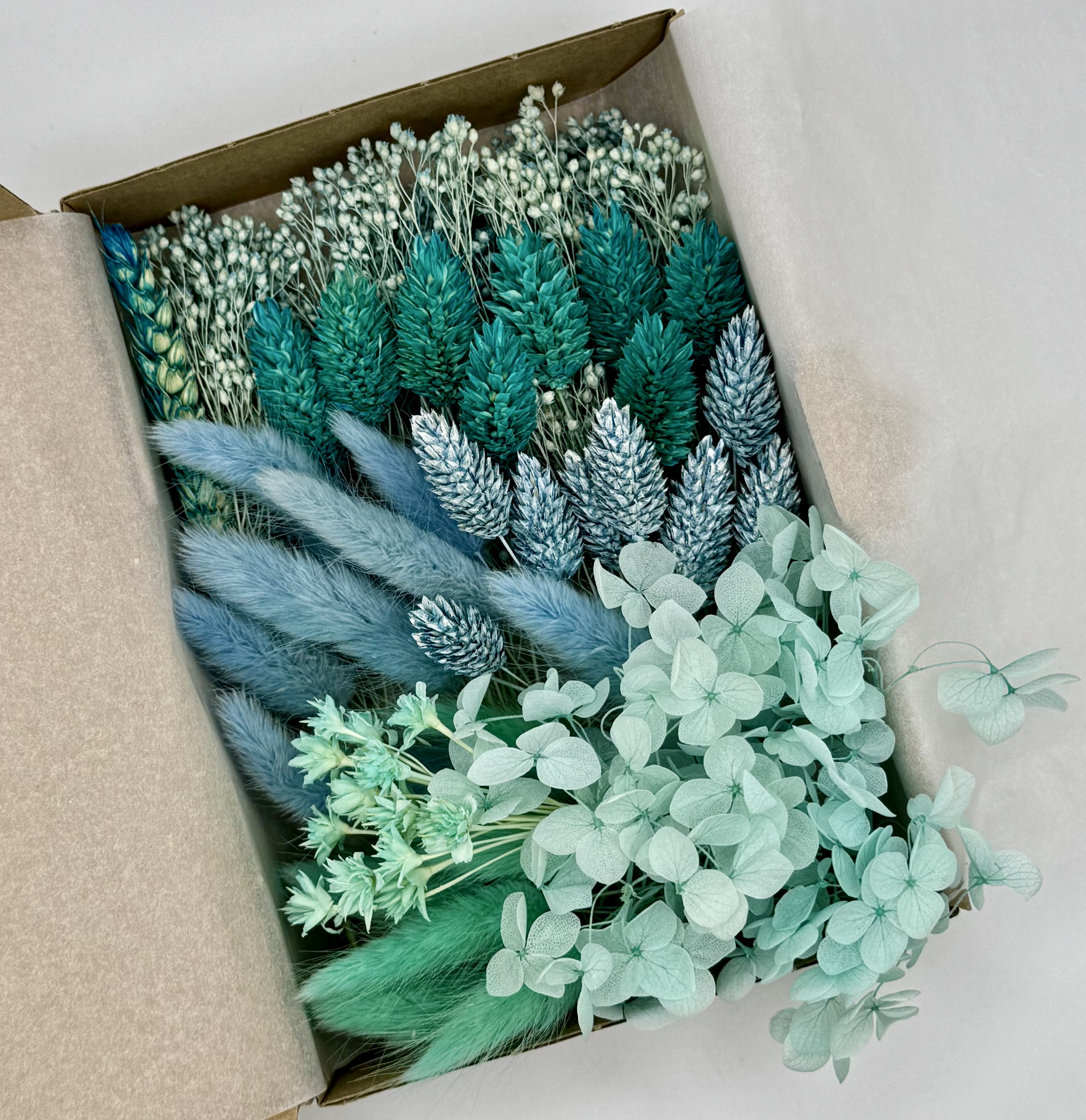 Die stilvolle Box „Wolkenkuss“ enthält eine edle Auswahl an Trockenblumen in Aquablau, Hellblau- und Grüntönen – darunter Lagurus (Hasenschwänzchen), Phalaris, Broom Bloom und Hortensie.
