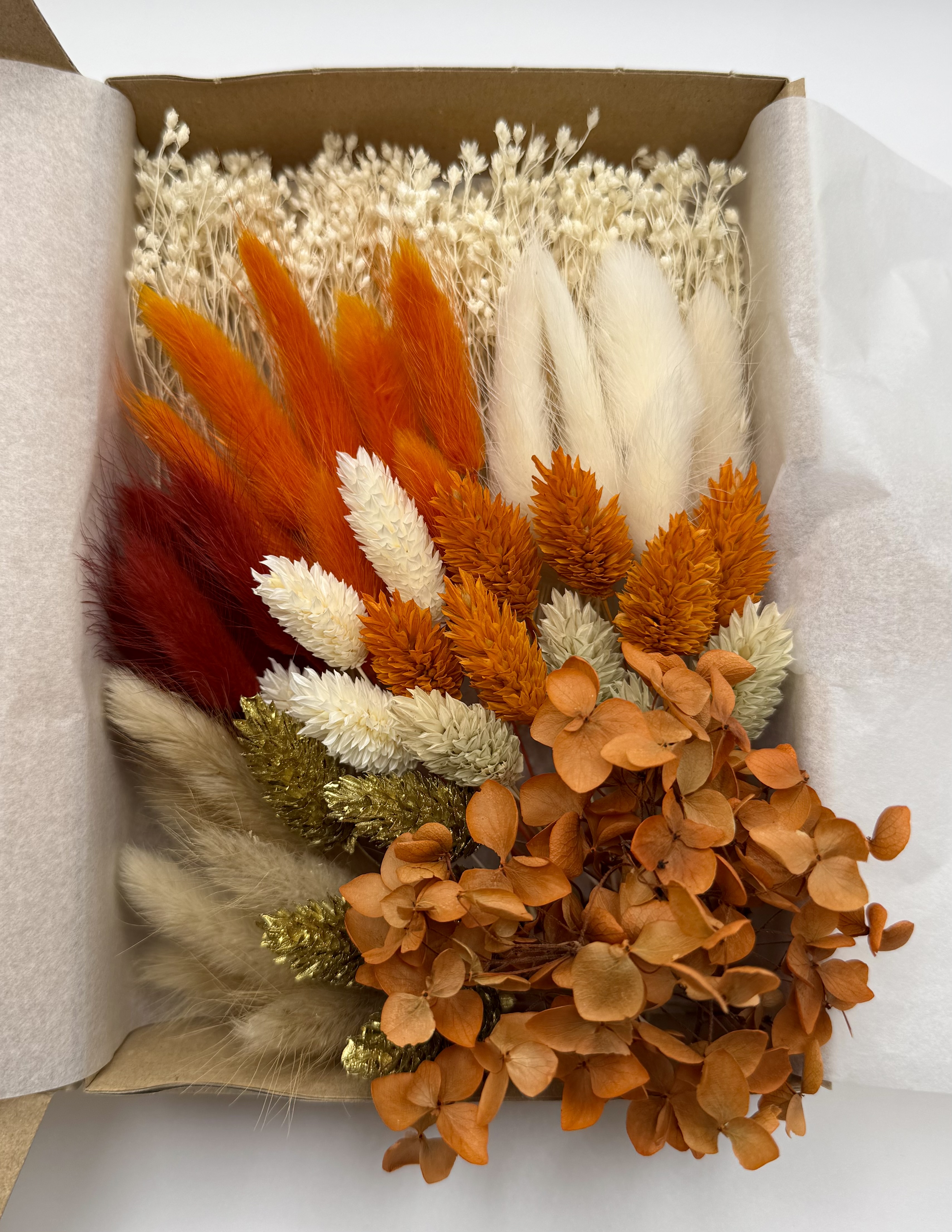Die stilvolle Box „Zimt & Blüte“ enthält eine edle Auswahl an Trockenblumen in kräftigen Orange-, Gold-, Rot-, Natur- und Weißtönen – darunter Lagurus (Hasenschwänzchen), Phalaris, Broom Bloom und Hortensie.