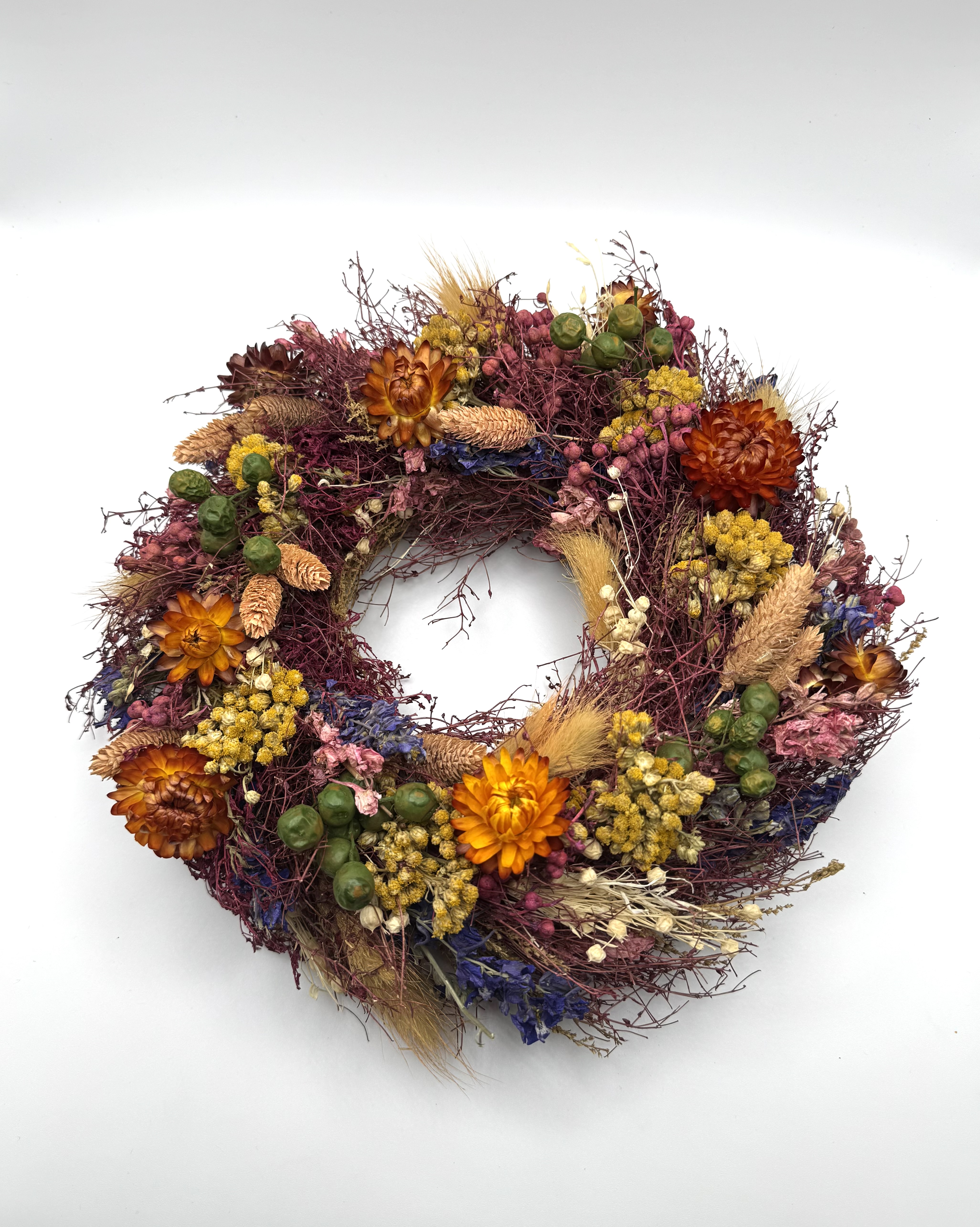 Der handgefertigte und farbenfrohe Herbstkranz No. 1 (Ø 28 cm) mit zarten Blüten bringt natürliche Leichtigkeit und zeitlose Schönheit in dein Zuhause. Mit seiner gezielten Farbauswahl an hochwertigen Trockenblumen ist er ein echter Blickfang an Wand oder Tisch.