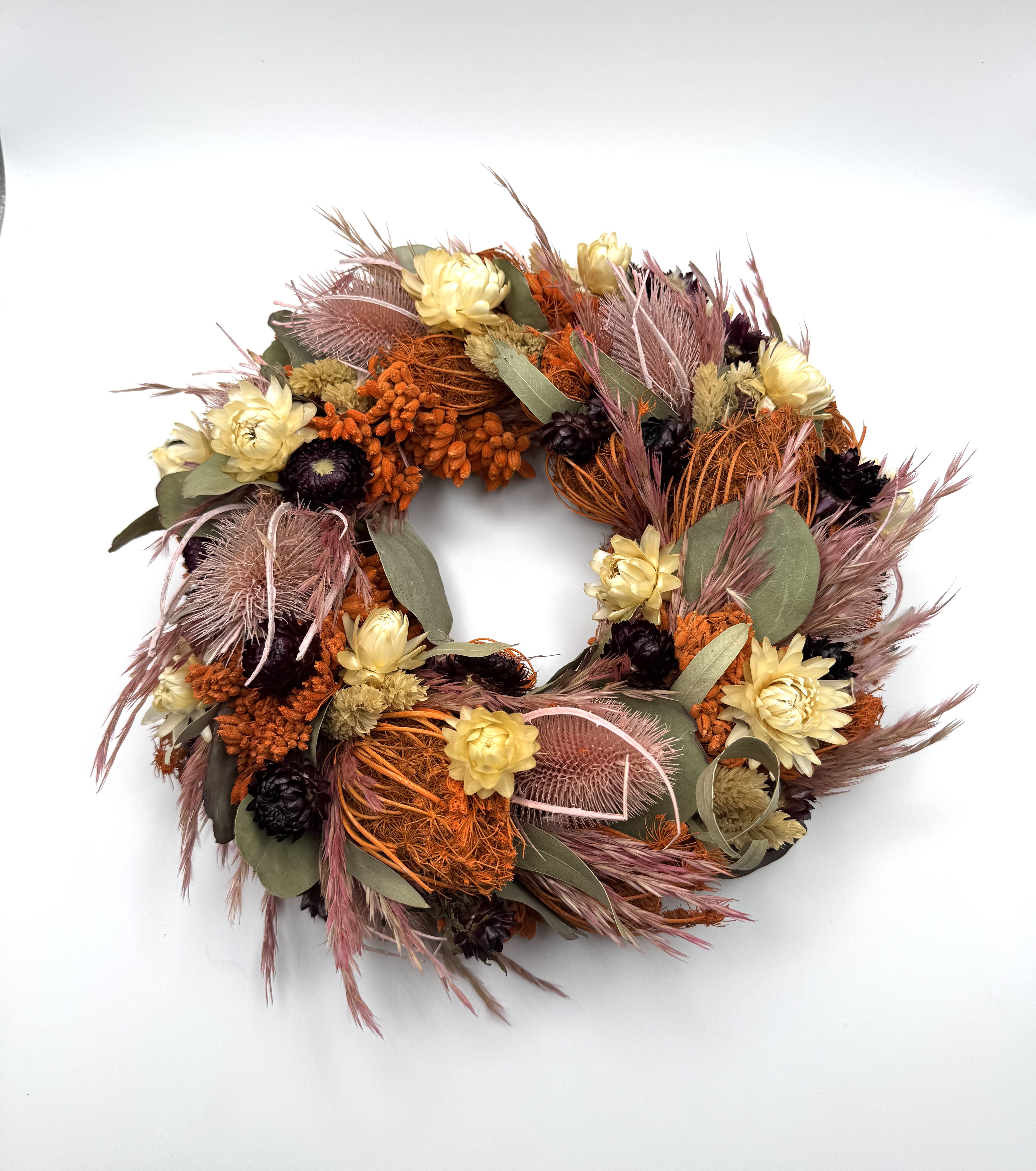 Der handgefertigte und farbenfrohe Herbstkranz No. 2 (Ø 28 cm) mit zarten Blüten bringt natürliche Leichtigkeit und zeitlose Schönheit in dein Zuhause. Mit seiner gezielten Farbauswahl an hochwertigen Trockenblumen ist er ein echter Blickfang an Wand oder Tisch.