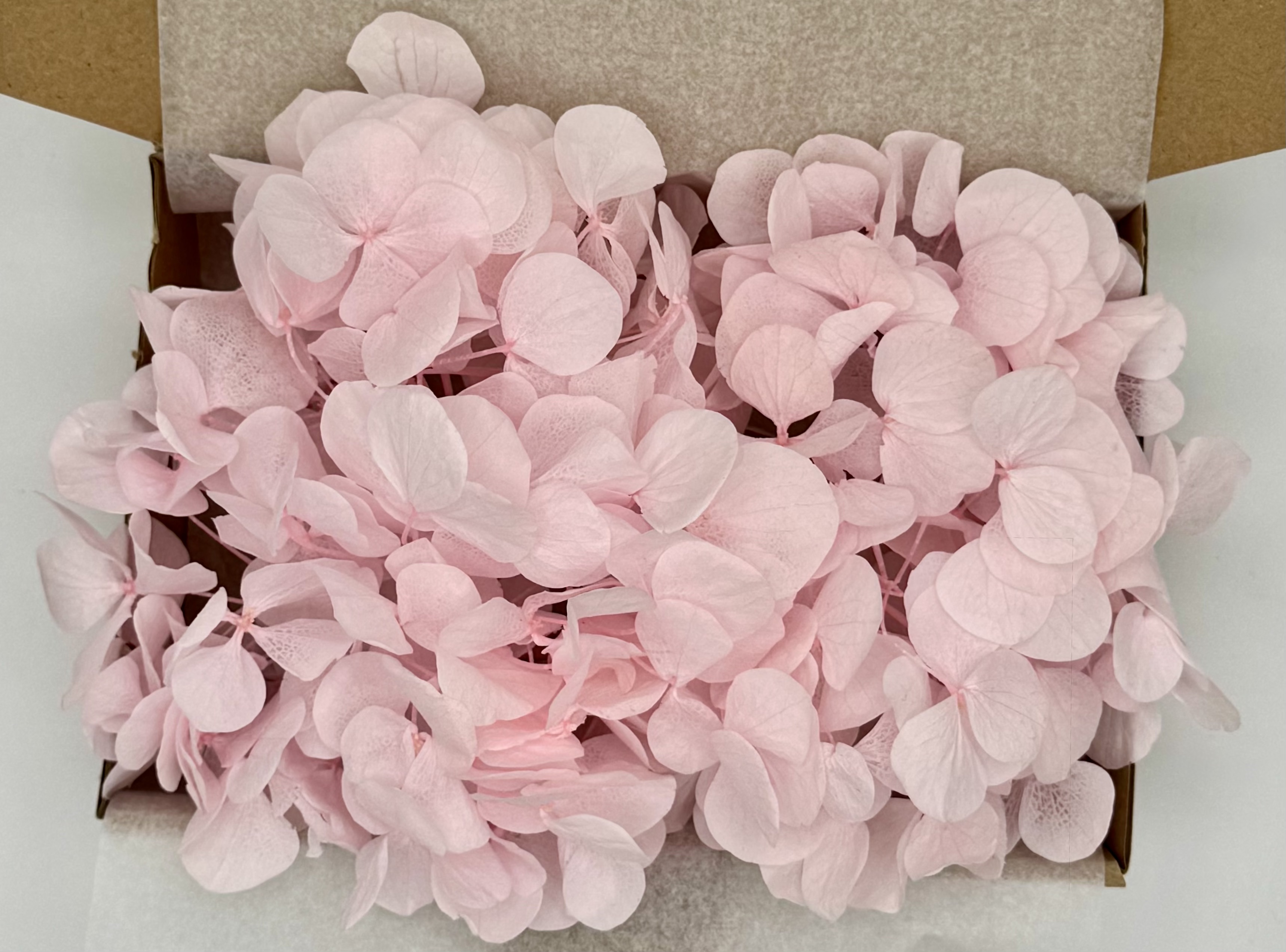 Die Box „Hortensienzauber“ steht euch in der Farbe rosa besteht aus konservierter Hortensie.