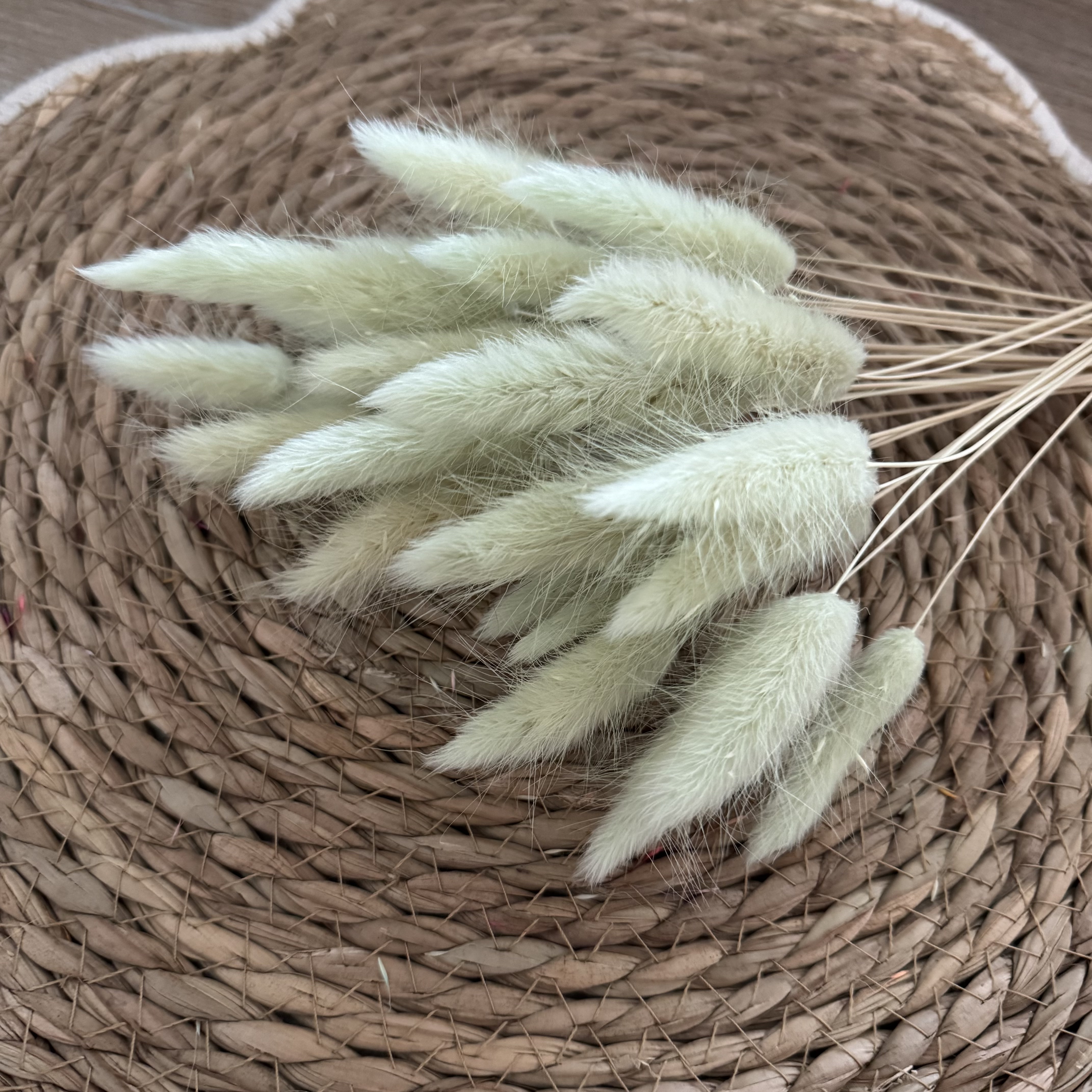 Durch die leichten und flexiblen Stiele eignet sich Lagurus ideal zum Binden von Kränzen. Die flauschigen Köpfe sorgen für Volumen und eine weiche Struktur, ohne dabei zu dominant zu wirken. Auch in Sträußen, Gestecken oder Trockenblumenringen lässt sich Lagurus vielseitig einsetzen und gut mit anderen Trockenblumen wie Eukalyptus, Pampasgras, Ruscus oder Phalaris kombinieren.