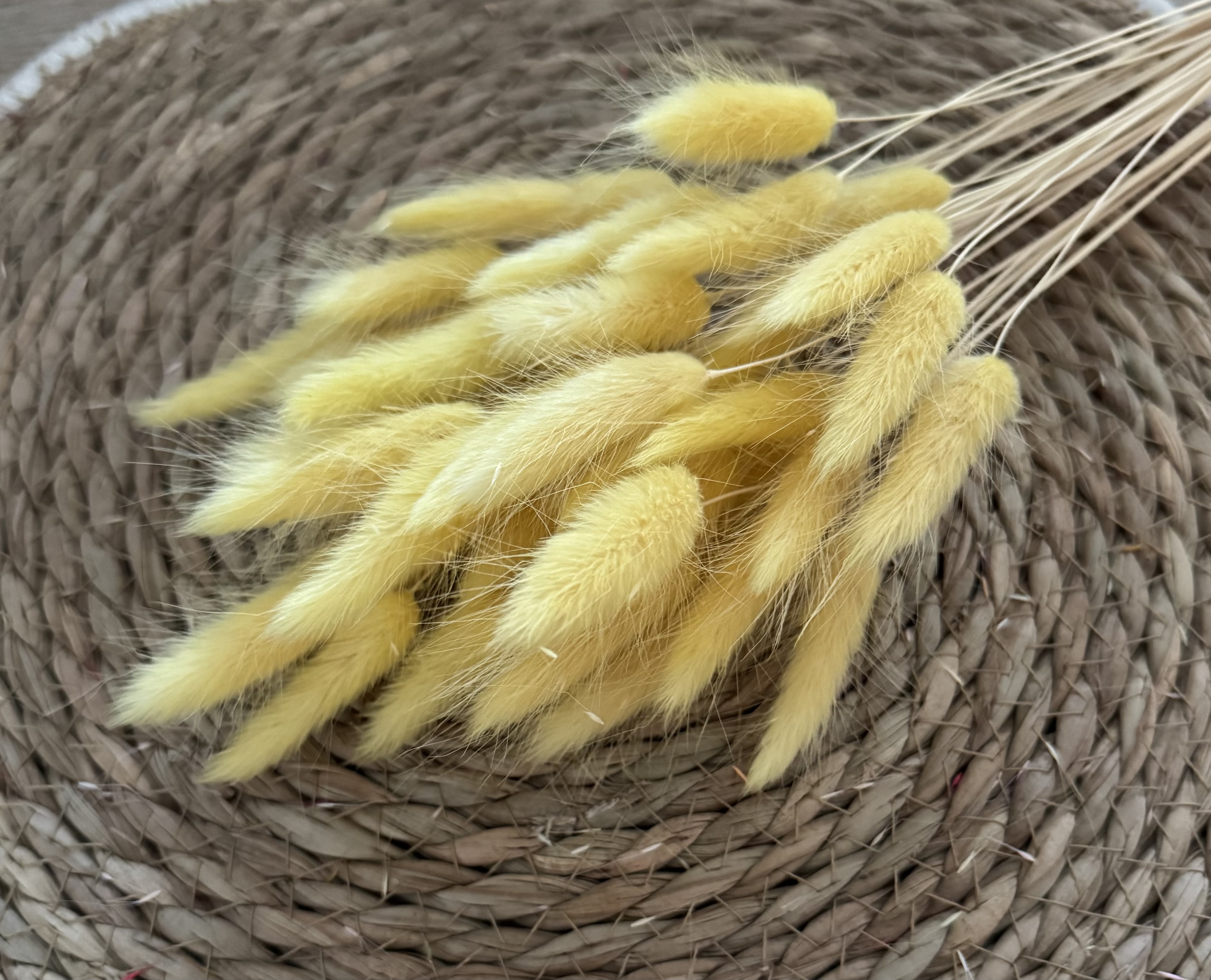 Durch die leichten und flexiblen Stiele eignet sich Lagurus ideal zum Binden von Kränzen. Die flauschigen Köpfe sorgen für Volumen und eine weiche Struktur, ohne dabei zu dominant zu wirken. Auch in Sträußen, Gestecken oder Trockenblumenringen lässt sich Lagurus vielseitig einsetzen und gut mit anderen Trockenblumen wie Eukalyptus, Pampasgras, Ruscus oder Phalaris kombinieren.