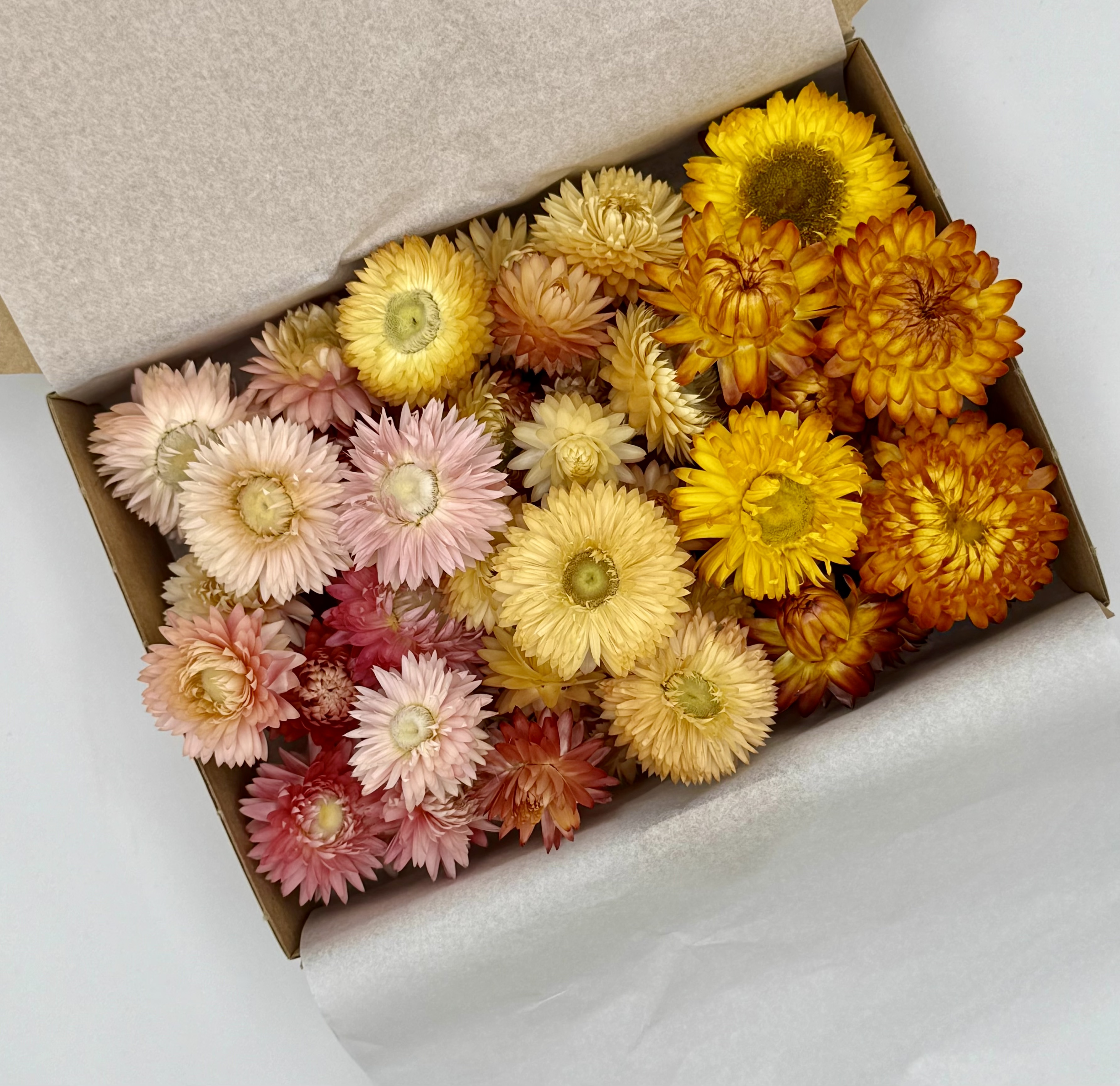Jede Strohblumenbox wird liebevoll von Hand für dich zusammengestellt, sodass jede Box einzigartig ist.